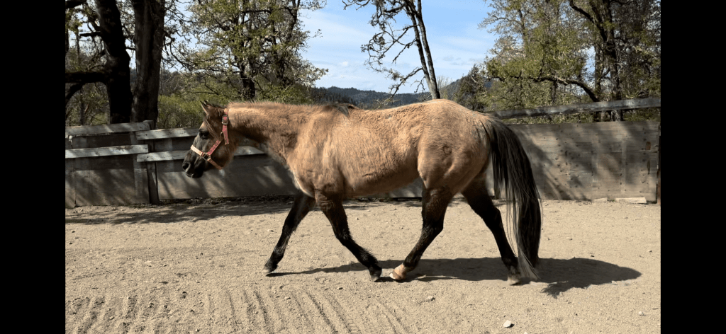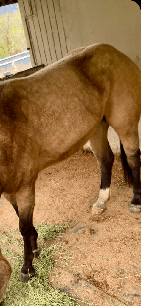 Two weeks ago I took in Dollie an almost 4 year old AQHA Quarter Horse mare. She was malnourished, infested in worms, her hooves were really odd and my farrier said due to lack of nutrition the hooves didn’t grow properly. With proper nutrients she hopefully will recover and start growing healthy hooves. She was sore all over due to lack of selenium which causes severe muscle soreness in acute deficiencies. She could hardly walk. The first week she was here I got her hooves trimmed and assessed by my farrier, she was vaccinated and dewormed. She’s been on high quality feed ever since her arrival and daily grain and vitamins with added selenium. She’s recovered now and pain free! She’s free from parasites, she’s shedding all her hair and getting a healthy summer coat. Dollie is now healthy enough to be out with my herd and she’s settling in well with them. She will be started on my training program this week and will be broke to ride in a few months!