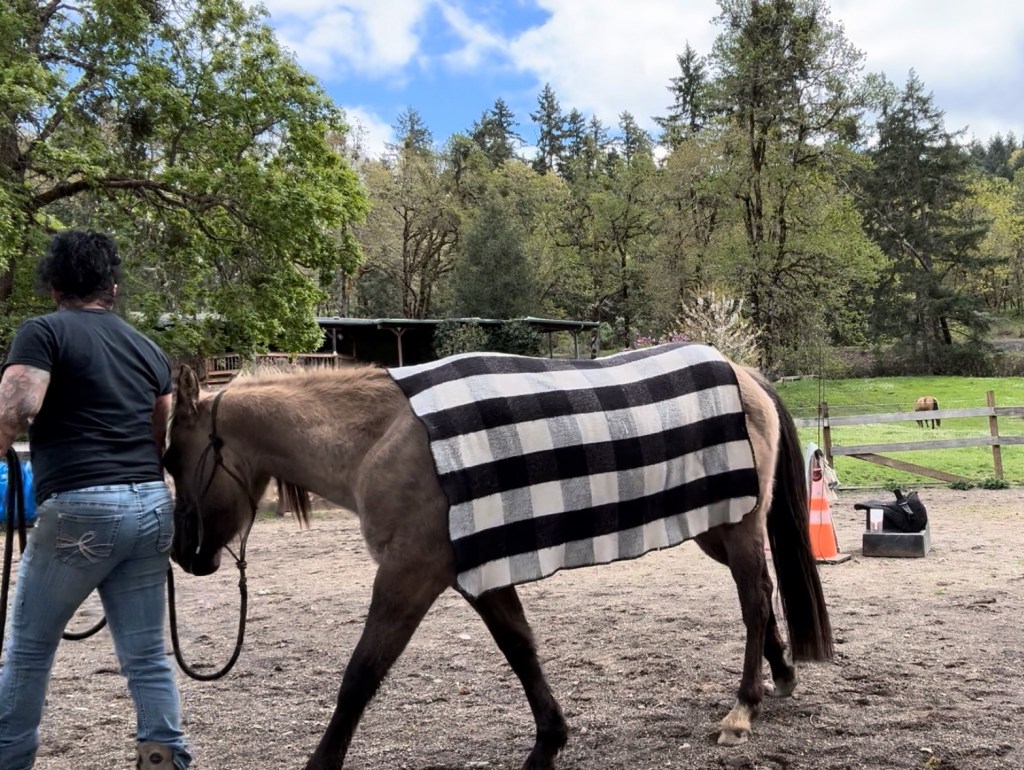 Dollie has never been saddled so these are the steps I take to prepare her to have her first saddle experience. I set them up to succeed, I want it to be boring for them then I know there’s no holes in the process. If they react instead of think then I know I missed a step and they’re telling me they’re not ready yet.