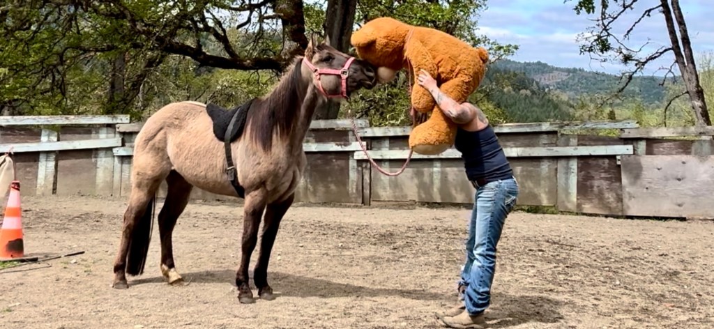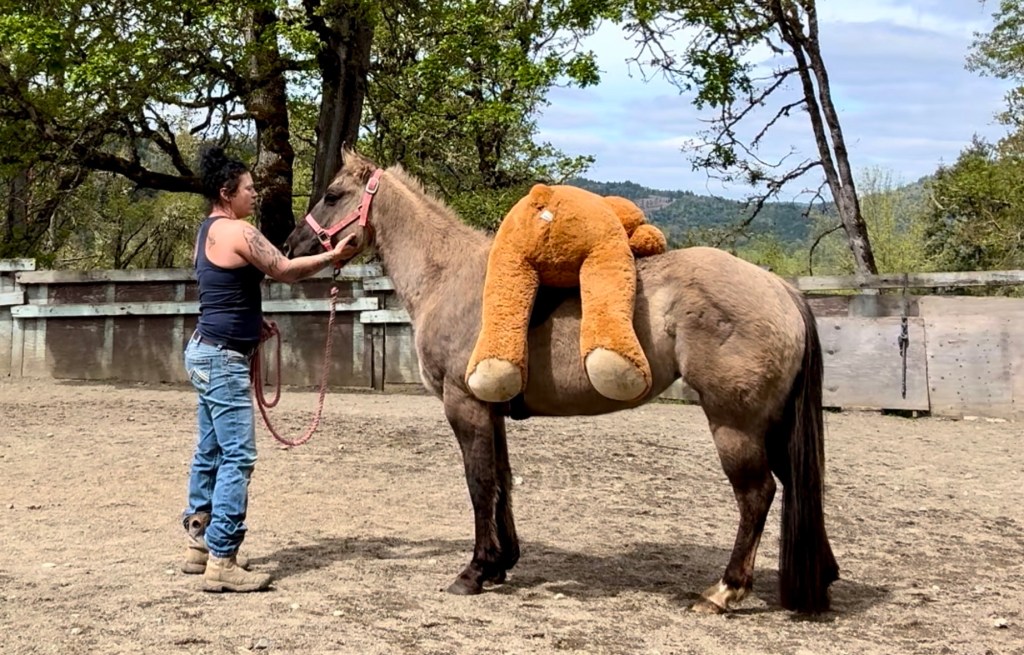 First she follows me with the bear. I put him on my shoulders to get her used to something above her Letting her investigate the bear while he’s on my shoulders and above her is very important to set her up to succeed having him on her back. First I lay him over her back, she can see him on both sides for her first timeI make sure to move her feet with the bear laying over her just like her first ride will go with a humanAlways let them check out the new thing being introducedShe took very good care of Mr. Bear