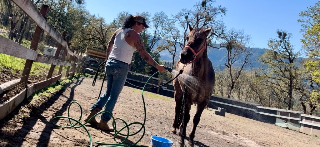Yesterday my two rescue horses arrived. Both are losing hair due to rain rot, they had medicated baths last night and they weren’t holding back their enjoyment which was so sweet to see! They’re both very cautious and wary of everything and everyone but after their baths last night with warm, medicated shampoo they both were following me around. They get their hooves trimmed tomorrow which is much needed and extremely over due. They’re getting caught up on TLC and they’re loving the attention like little love sponges! They’re both registered AQHA quarter horses! Watch their journey here!