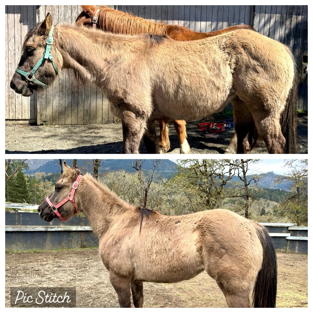 When “Kat” sorrel, and “Dollie” arrived yesterday. They’re in the arena together to settle in with the least amount of stress and they can still meet the other horses over the railing.Kat and Dollie had their warm, medicated baths, grain and much needed grooming and detangling their knotted and matted manes!